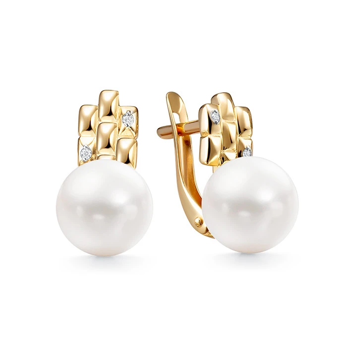 Серьги выполнены из красного золота 585 пробы и украшены жемчужинами пресной воды. Качество жемчужин на серьгах наивысшее, жемчужины имеют очень яркий перламутровый блеск, гладкую и ровную поверхность с минимальным количеством природных изъянов, форма жемчужин сплющенная (пуговица).