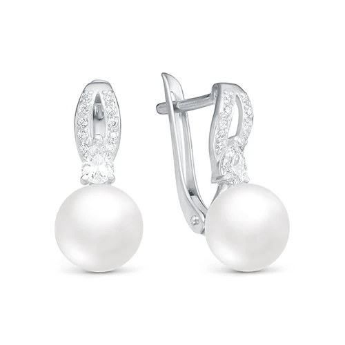 Серьги выполнены из золота 585 пробы, украшены фианитами и белыми пресноводными жемчужинами. Производство — Россия.