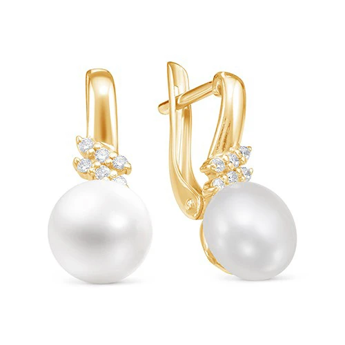Серьги выполнены из золота 585 пробы, украшены фианитами и белыми пресноводными жемчужинами.