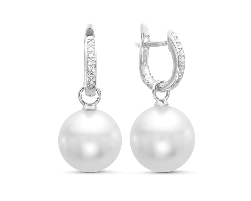 Эксклюзивные серьги-трансформеры выполнены из белого золота 585 пробы и украшены белыми Австралийскими морскими жемчужинами. Качество жемчужин на серьгах очень высокое, жемчужины имеют яркий перламутровый блеск, ровную и гладкую поверхность с минимальным количеством природных изъянов. Форма жемчужин идеальная круглая.