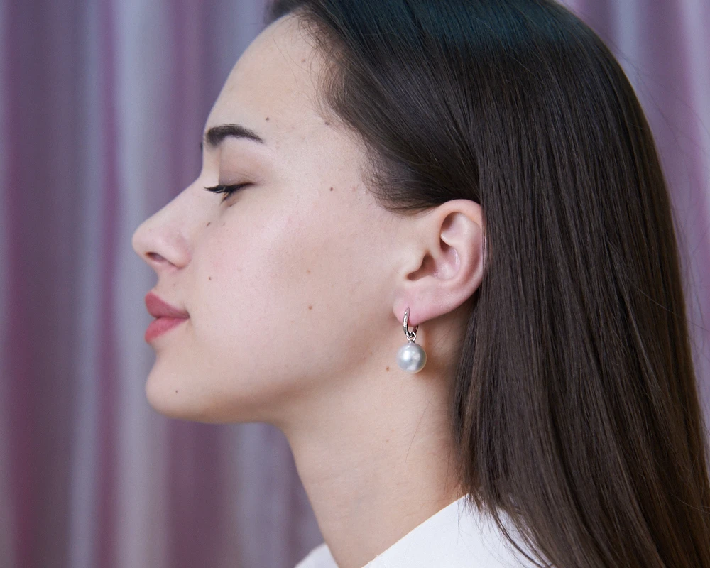 Серьги-трансформеры выполнены из белого золота 585 пробы и украшены крупными японскими пресноводными жемчужинами «Эдисон». Качество жемчужин на серьгах наивысшее, количество природных изъянов на поверхности жемчуга минимальное. Жемчужины имеют очень яркий перламутровый блеск, форма жемчужин идеальная круглая.