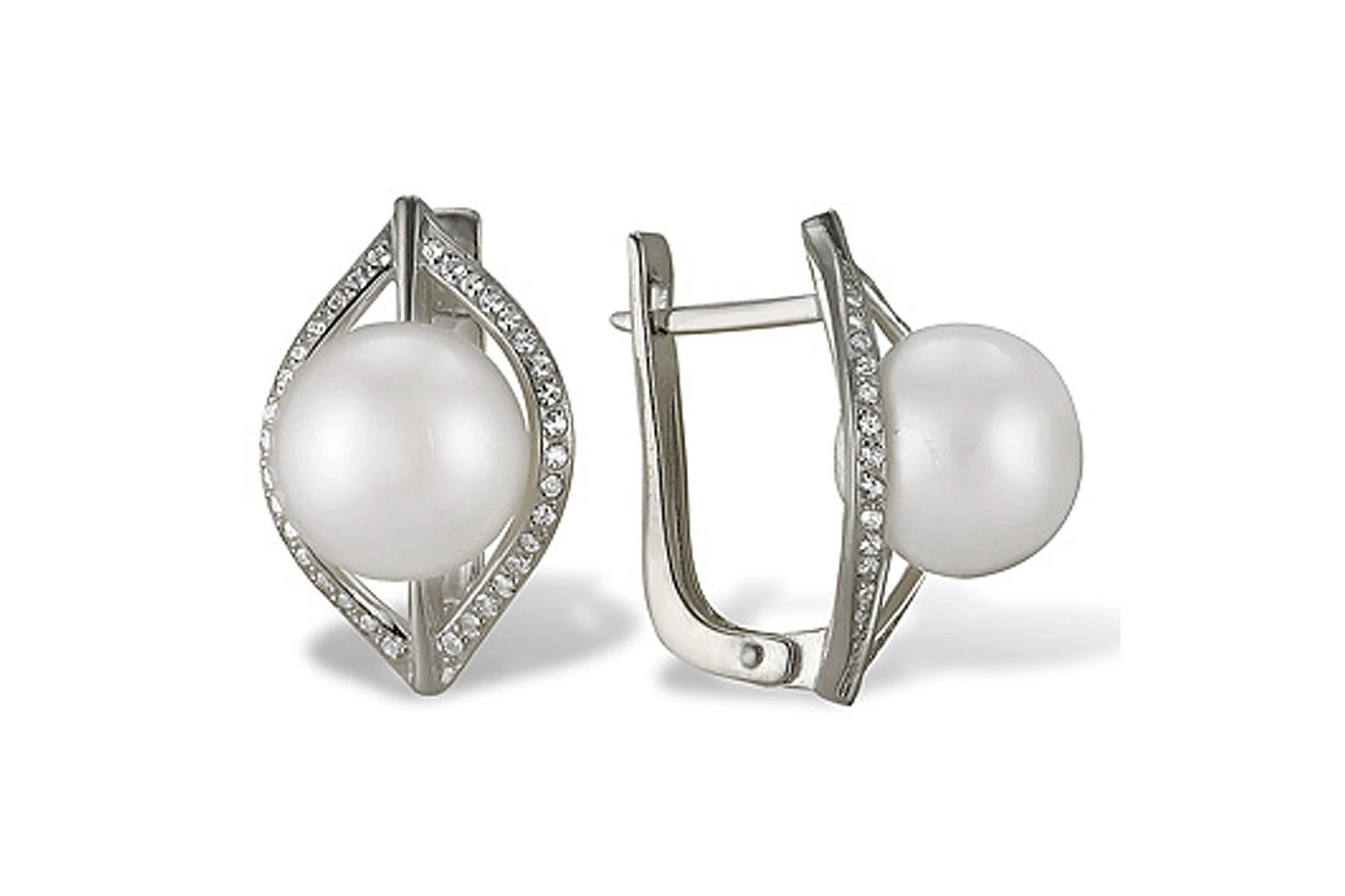Серьги выполнены из белого золота 585 пробы и украшены жемчужинами пресной воды. Качество жемчужин на серьгах наивысшее, жемчужины имеют очень яркий перламутровый блеск, гладкую и ровную поверхность с минимальным количеством природных изъянов, форма жемчужин круглая (сфера).