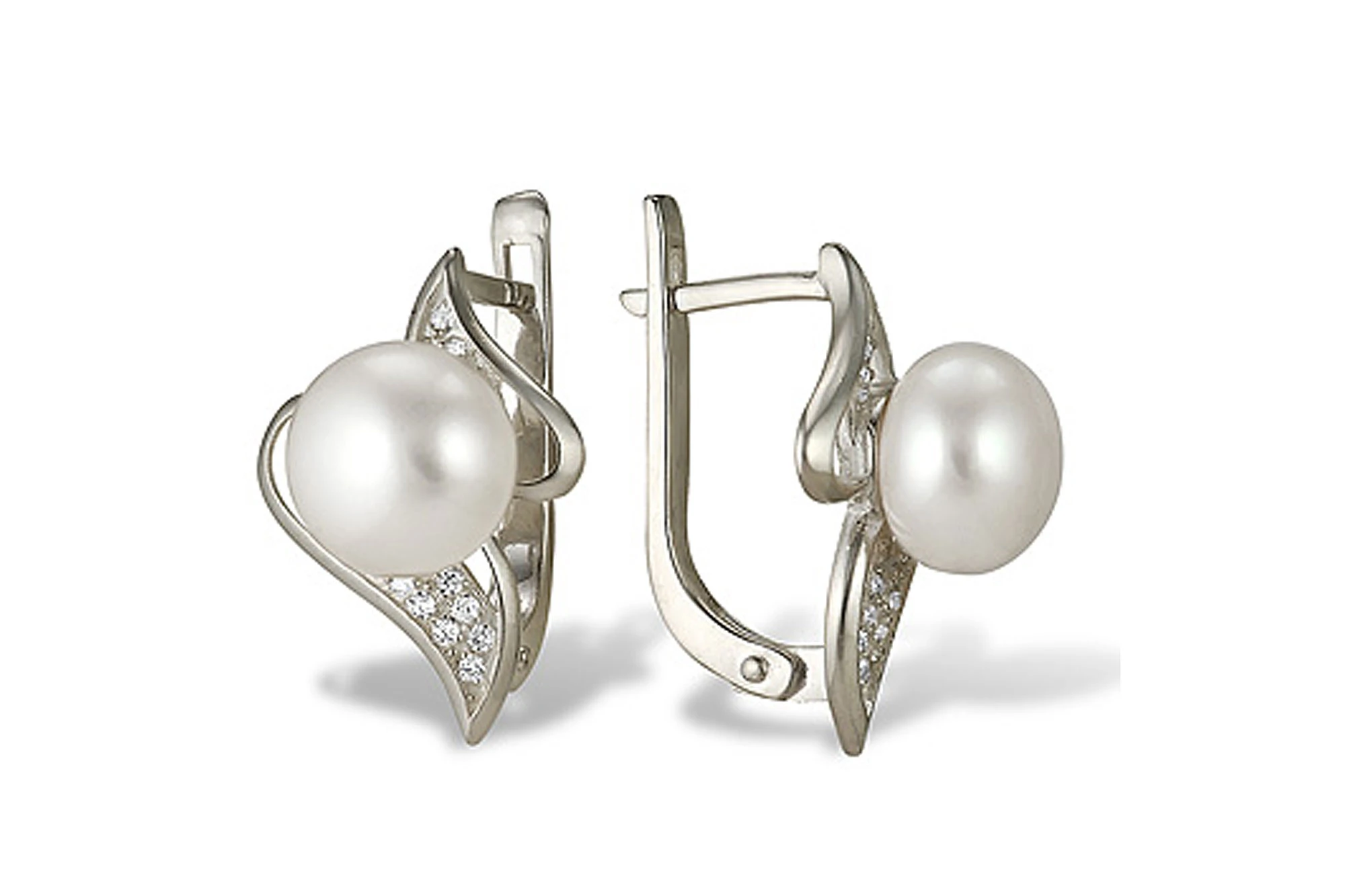 Серьги выполнены из белого золота 585 пробы и украшены жемчужинами пресной воды. Качество жемчужин на серьгах наивысшее, жемчужины имеют очень яркий перламутровый блеск, гладкую и ровную поверхность с минимальным количеством природных изъянов, форма жемчужин круглая (на фото изображены серьги со сплющенными жемчужинами).