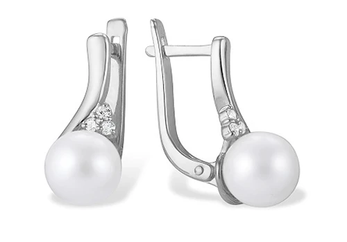 Серьги выполнены из белого золота 585 пробы и украшены жемчужинами пресной воды. Качество жемчужин на серьгах наивысшее, жемчужины имеют очень яркий перламутровый блеск, гладкую и ровную поверхность с минимальным количеством природных изъянов, форма жемчужин круглая (сфера).