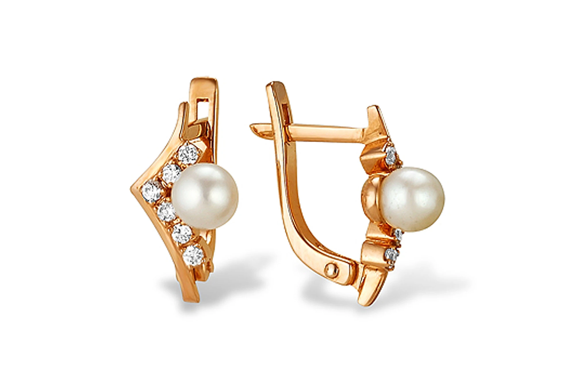 Серьги выполнены из красного золота 585 пробы и украшены жемчужинами пресной воды. Качество жемчужин на серьгах наивысшее, жемчужины имеют очень яркий перламутровый блеск, гладкую и ровную поверхность с минимальным количеством природных изъянов, форма жемчужин круглая.