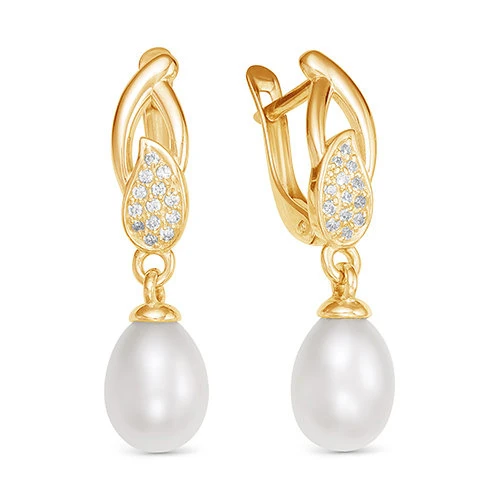 Серьги из желтого золота с белыми речными жемчужинами 9-10 мм, (1226)