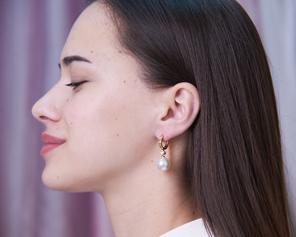 Эксклюзивные серьги выполнены из желтого золота 585 пробы и украшены белыми Австралийскими морскими жемчужинами. Качество жемчужин на серьгах наивысшее, жемчужины имеют очень яркий перламутровый блеск, природные изъяны на поверхности жемчуга отсутствуют или имеются в единичном количестве. Форма жемчужин идеальная круглая.