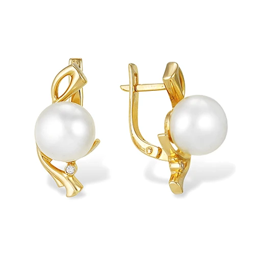 Серьги выполнены из желтого золота 585 пробы и украшены жемчужинами пресной воды. Качество жемчужин на серьгах наивысшее, жемчужины имеют очень яркий перламутровый блеск, гладкую и ровную поверхность с минимальным количеством природных изъянов, форма жемчужин круглая (сфера).