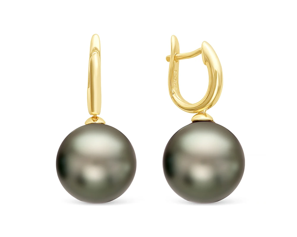 Серьги из желтого золота с черными морскими Таитянскими жемчужинами 11-11,5 мм, (2622)