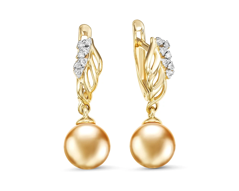 Изящные серьги выполнены из желтого золота 585 пробы и украшены золотистыми японскими морскими жемчужинами Акойя. Качество жемчужин на серьгах наивысшее, количество природных изъянов на поверхности жемчуга минимальное. Жемчужины имеют очень яркий перламутровый блеск, форма жемчужин идеальная круглая.