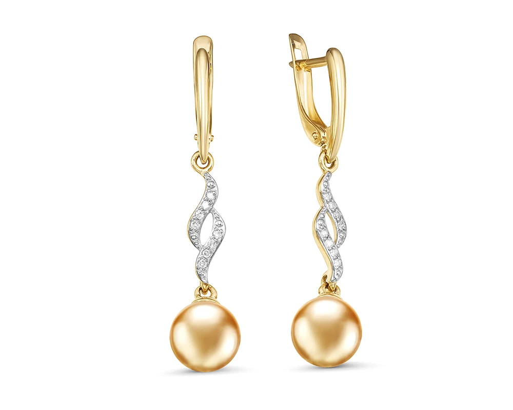 Изящные серьги выполнены из желтого золота 585 пробы и украшены золотистыми японскими морскими жемчужинами Акойя. Качество жемчужин на серьгах наивысшее, количество природных изъянов на поверхности жемчуга минимальное. Жемчужины имеют очень яркий перламутровый блеск, форма жемчужин идеальная круглая.