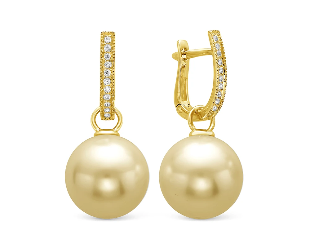 Эксклюзивные серьги-трансформеры выполнены из желтого золота 585 пробы и украшены золотистыми Австралийскими морскими жемчужинами. Качество жемчужин на серьгах наивысшее, жемчужины имеют очень яркий перламутровый блеск, природные изъяны на поверхности жемчуга отсутствуют или имеются в единичном количестве. Форма жемчужин идеальная круглая.