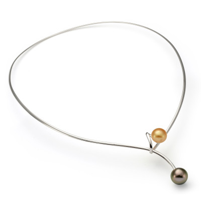 Колье выполнено из серебра 925 пробы и украшено двумя настоящими морскими жемчужинами: Австралийской и Таитянской. Колье стильно прилегает к шее.