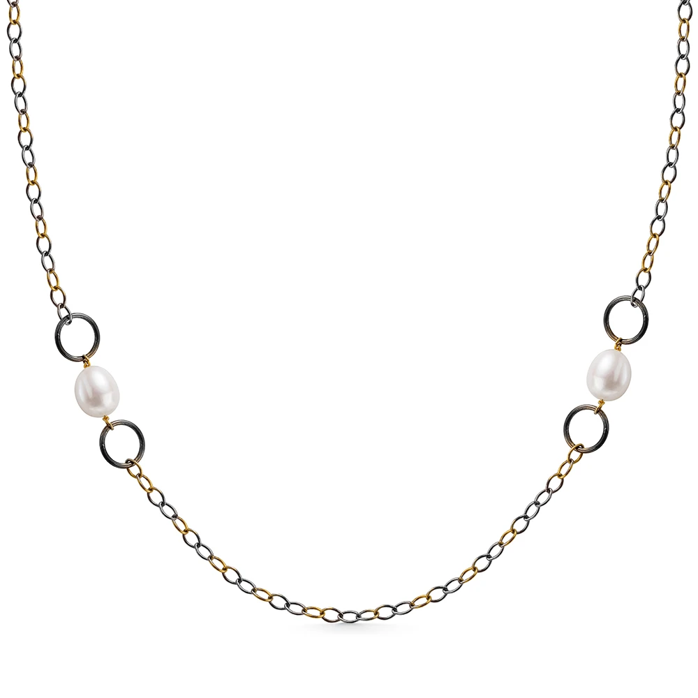 Колье из серебра 925 пробы украшено белыми пресноводными жемчужинами. Максимальная длина цепочки - 55 см. Покрытие - родий и позолота.