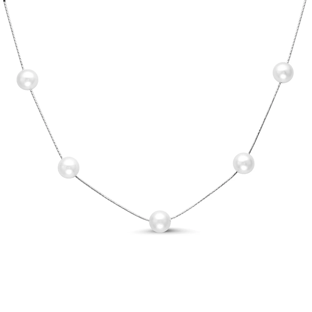 Цепочка из серебра 925 пробы украшена прекрасными белыми пресноводными жемчужинами идеальной сферической формы. Качество жемчужин среднее.