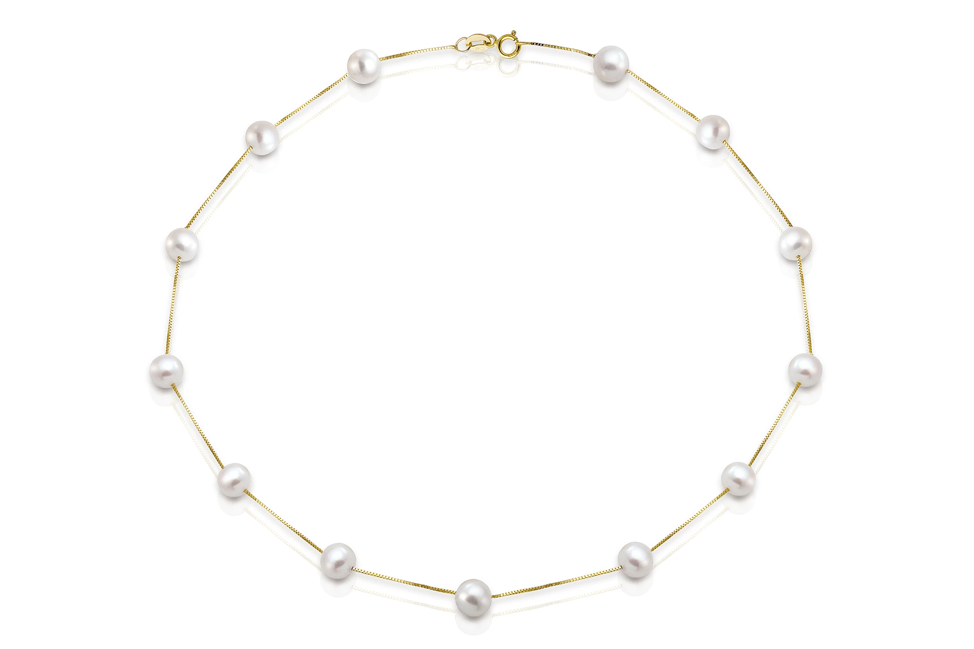Цепочка из серебра 925 пробы с золотым покрытием "желтое золото" украшена прекрасными белыми пресноводными жемчужинами идеальной сферической формы.