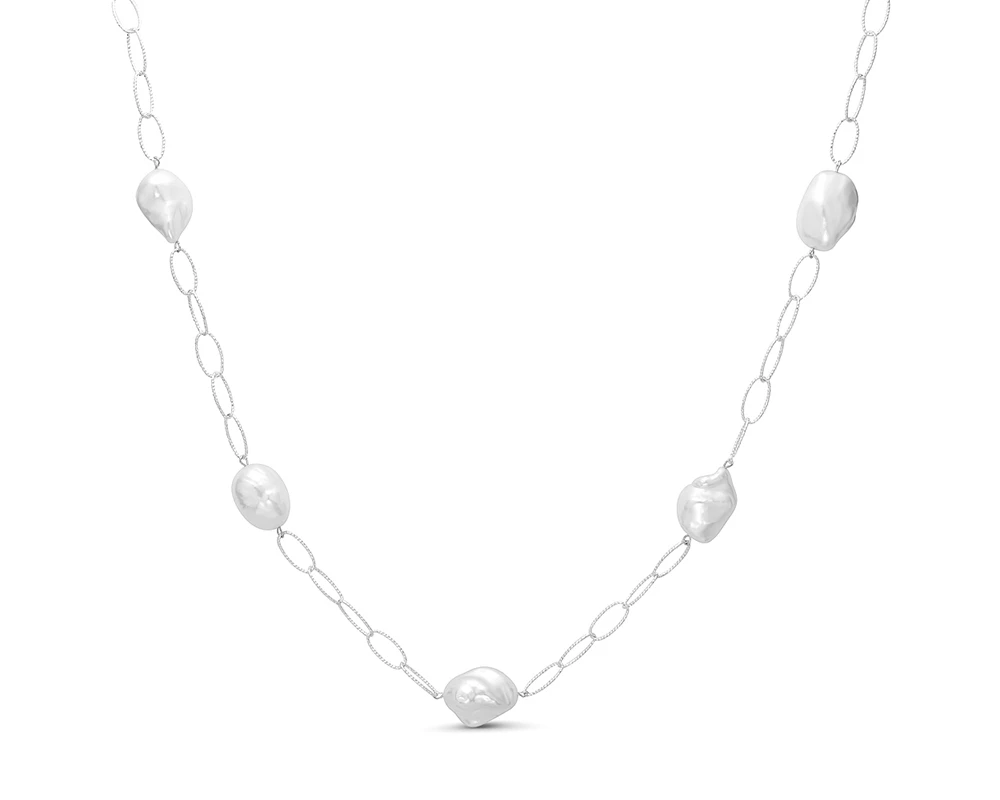 Цепочка из серебра 925 пробы украшена прекрасными белыми пресноводными жемчужинами барочной формы без дефектов поверхности.