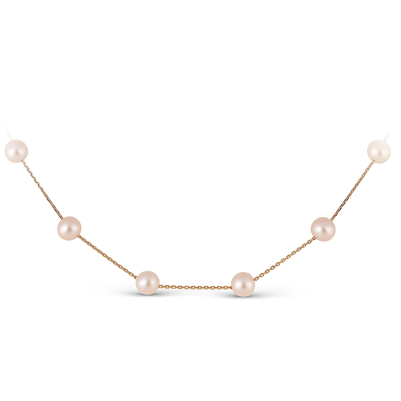 Цепочка из золота 585 пробы украшена прекрасными белыми морскими жемчужинами идеальной сферической формы без дефектов поверхности. Родина жемчужин — теплые воды Южно—Китайского моря.