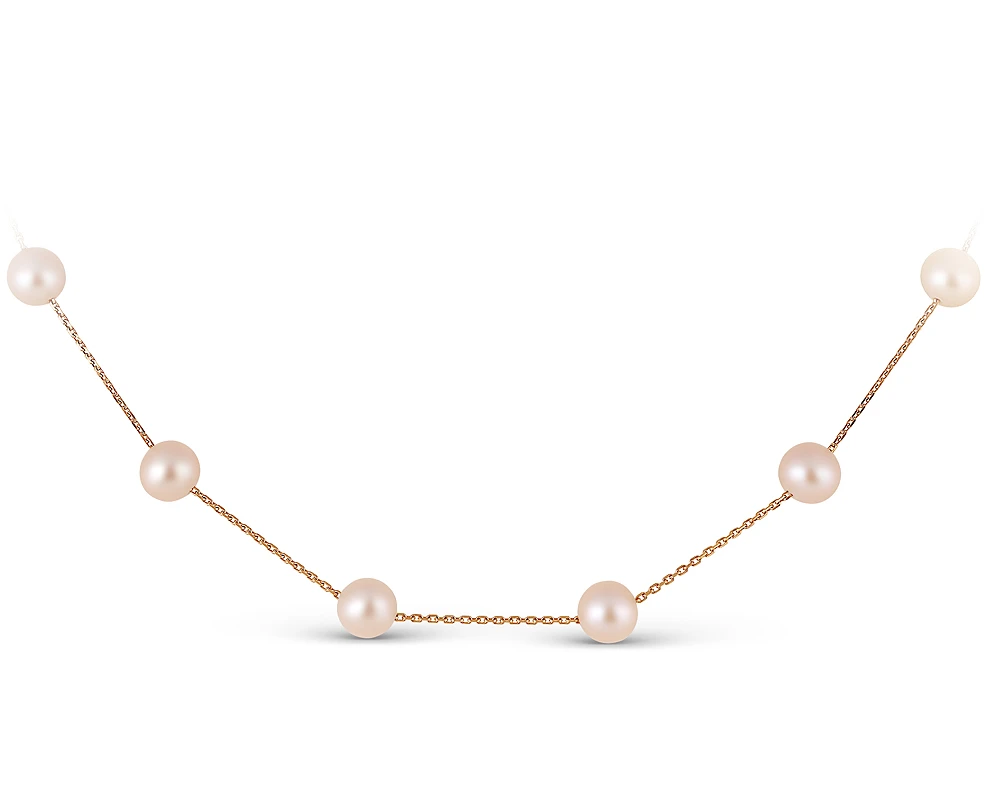 Цепочка из золота 585 пробы украшена прекрасными розовыми морскими жемчужинами идеальной сферической формы без дефектов поверхности. Родина жемчужин — теплые воды Южно—Китайского моря.