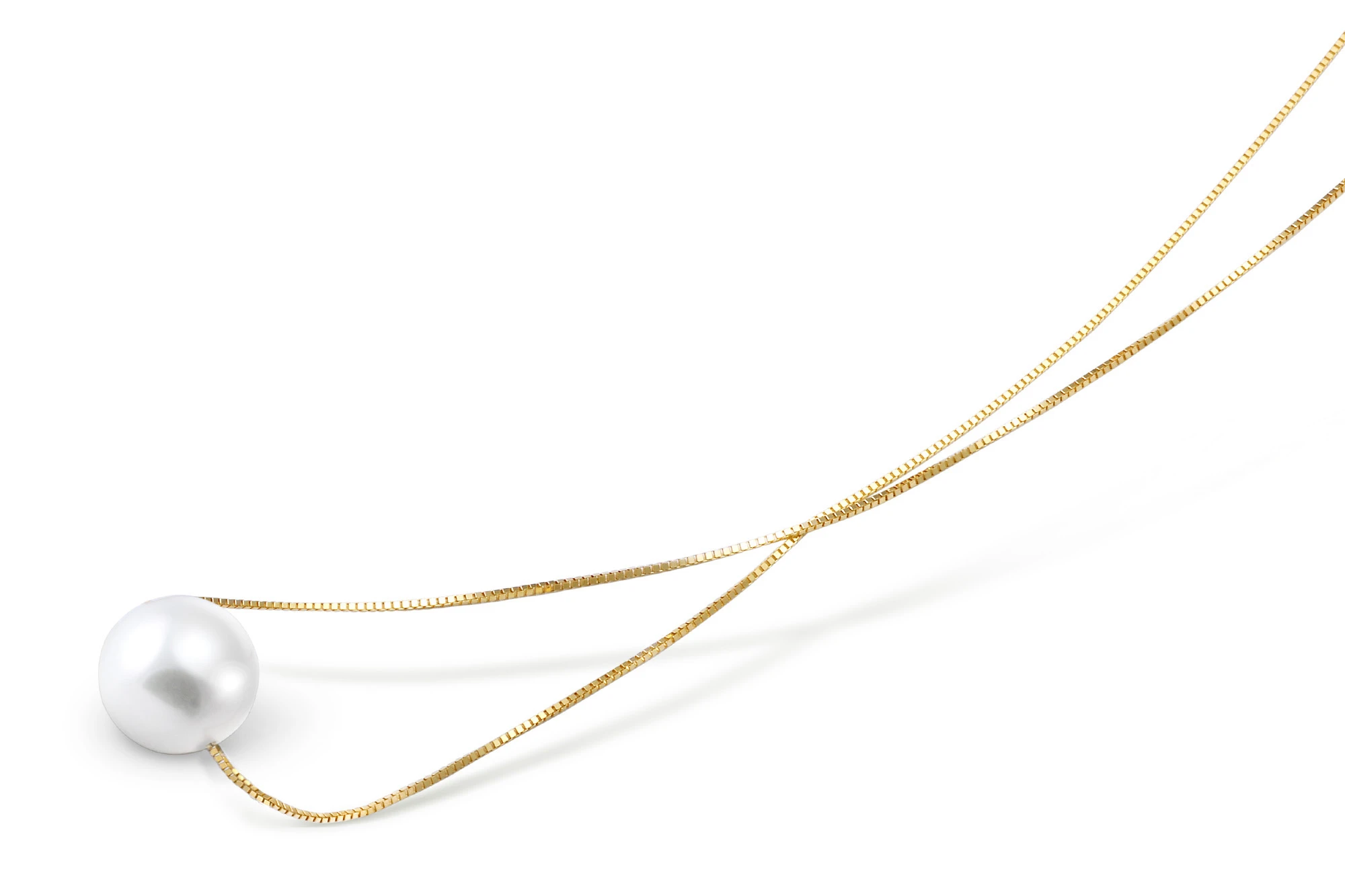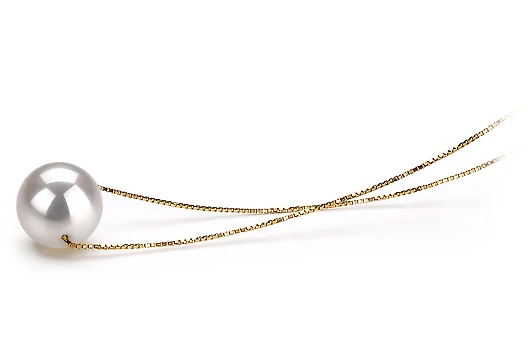 Цепочка из золота 750 пробы украшена прекрасной белой морской жемчужиной идеальной сферической формы без дефектов поверхности. Родина жемчужины — теплые воды Южно—Китайского моря.