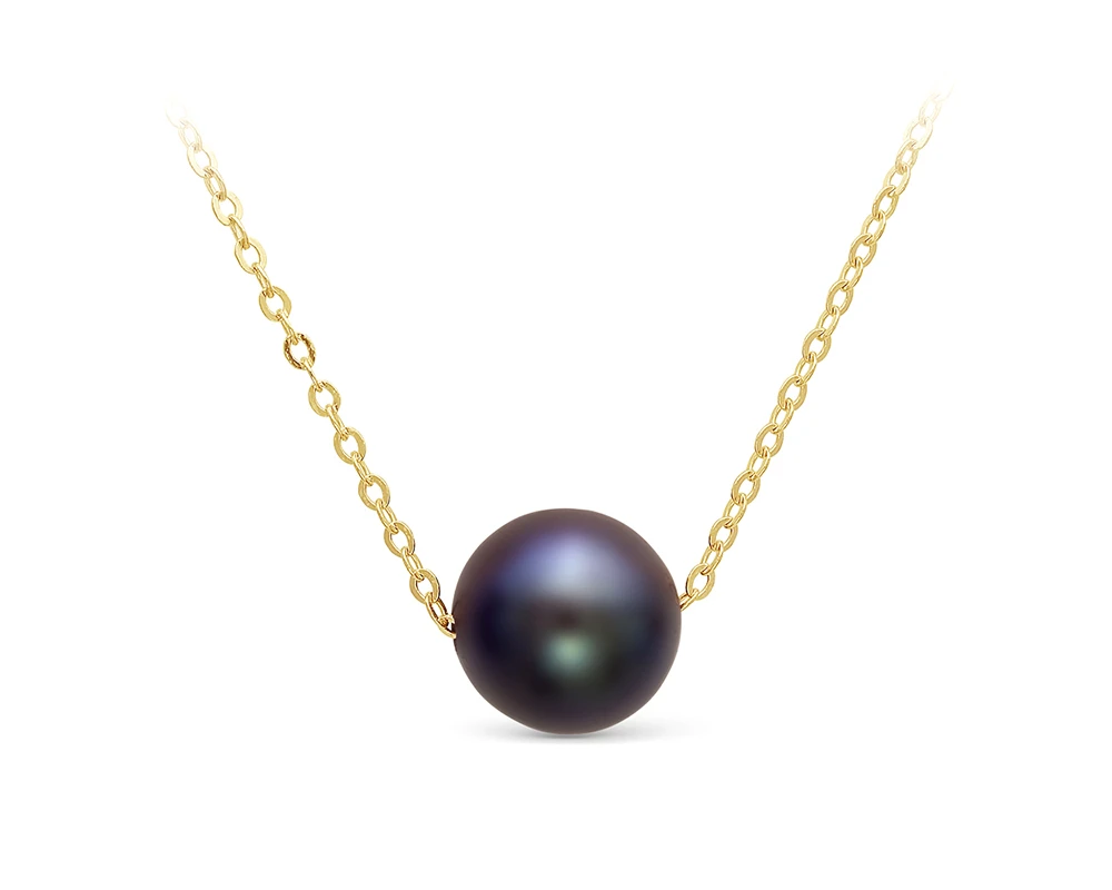 Цепочка из золота 585 пробы украшена прекрасной черной морской жемчужиной идеальной сферической формы без дефектов поверхности. Родина жемчужины — теплые воды Южно—Китайского моря.