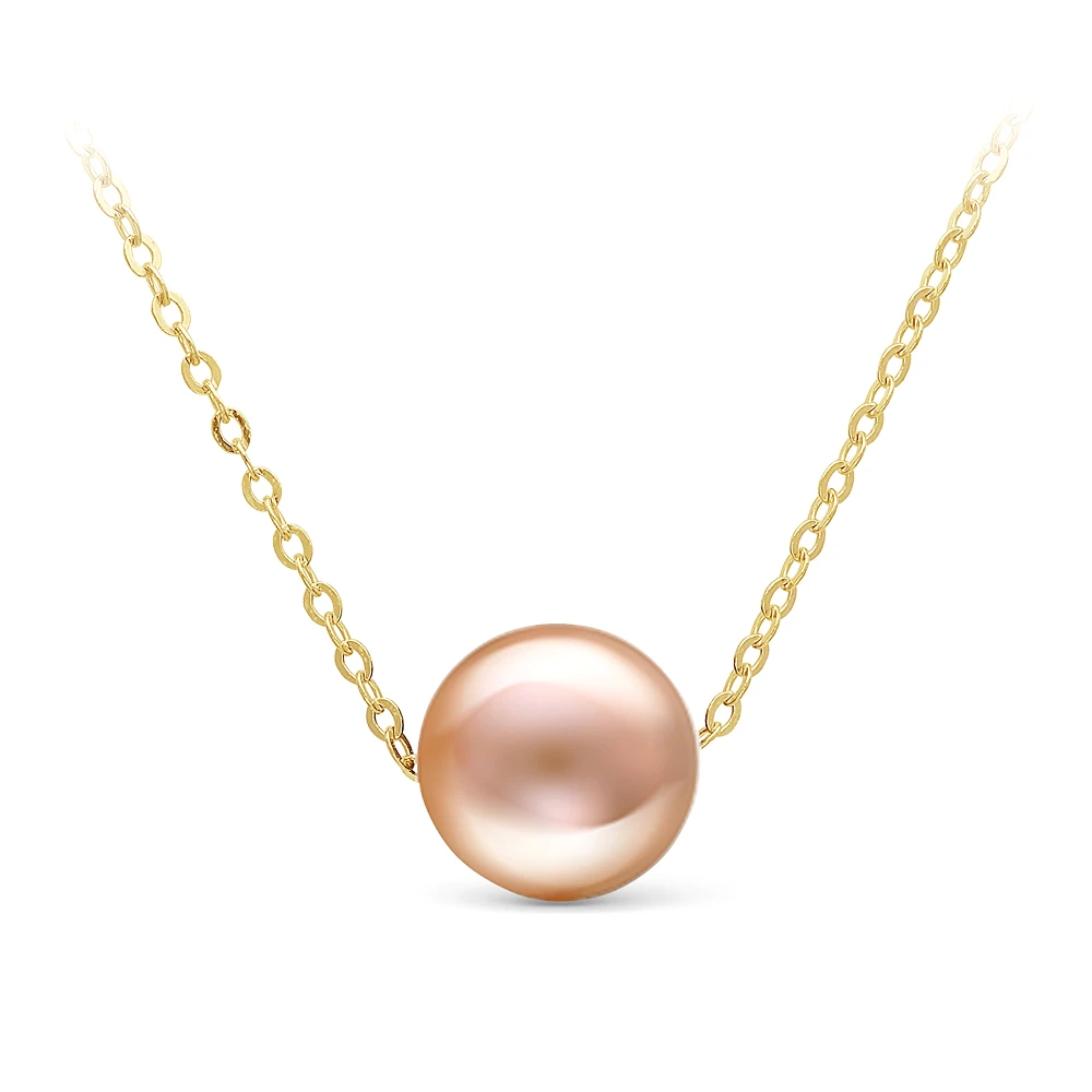 Цепочка из золота 585 пробы украшена прекрасной розовой морской жемчужиной идеальной сферической формы без дефектов поверхности. Родина жемчужины — теплые воды Южно—Китайского моря.