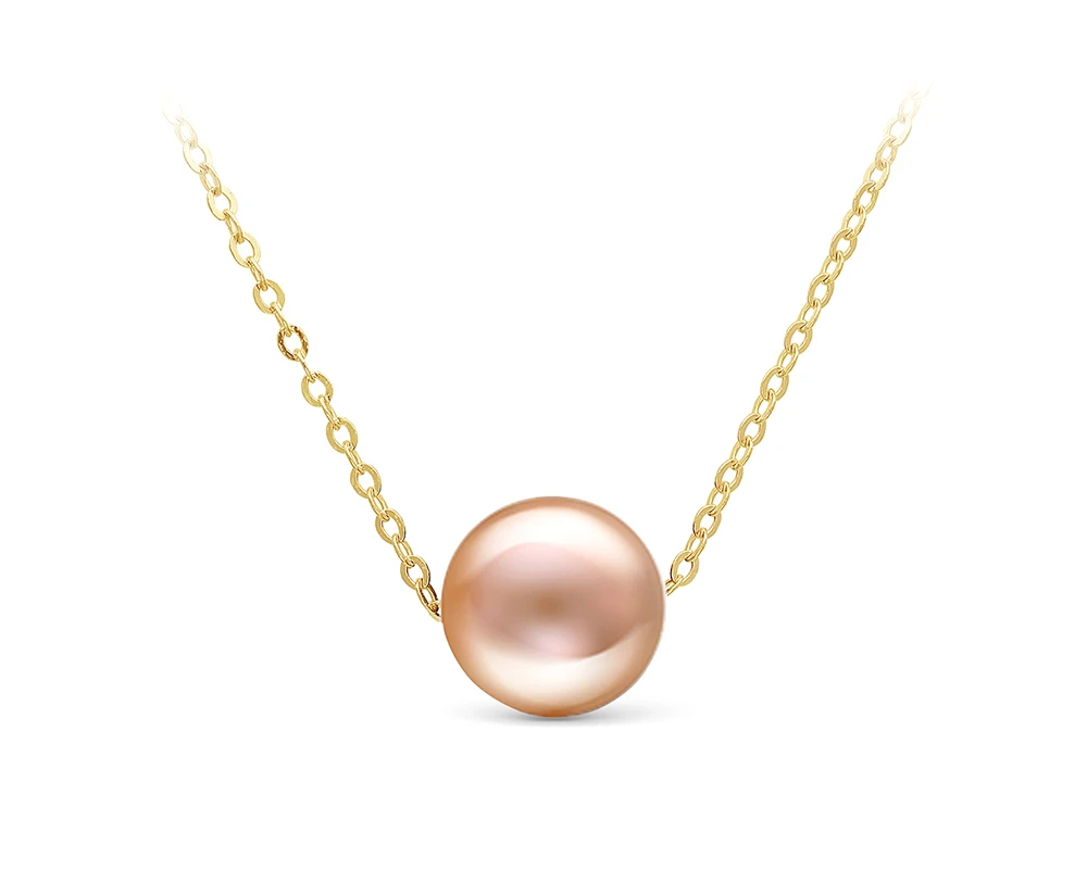 Цепочка из золота 585 пробы украшена прекрасной розовой морской жемчужиной идеальной сферической формы без дефектов поверхности. Родина жемчужины — теплые воды Южно—Китайского моря.