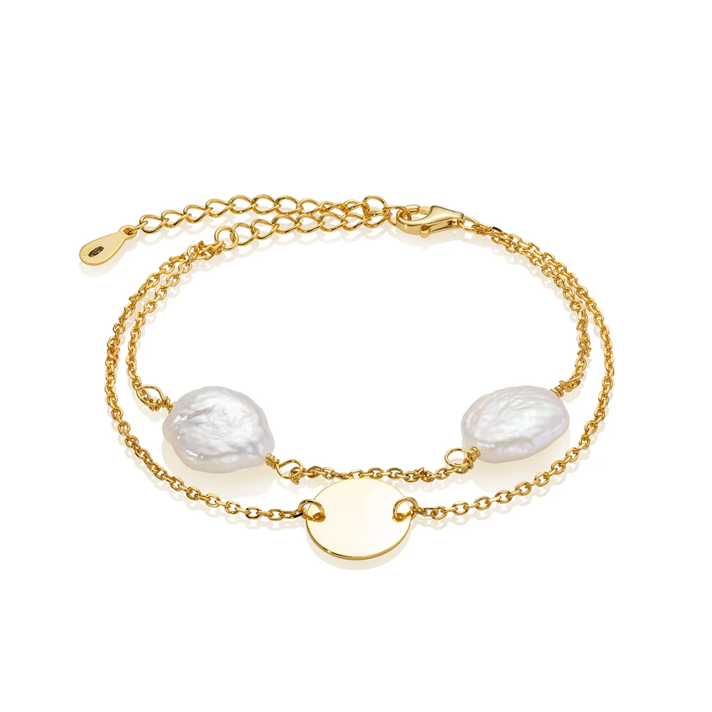 Стильный браслет выполнен из серебра 925 пробы с покрытием "желтое золото", украшен барочными жемчужинами, браслет безразмерный.