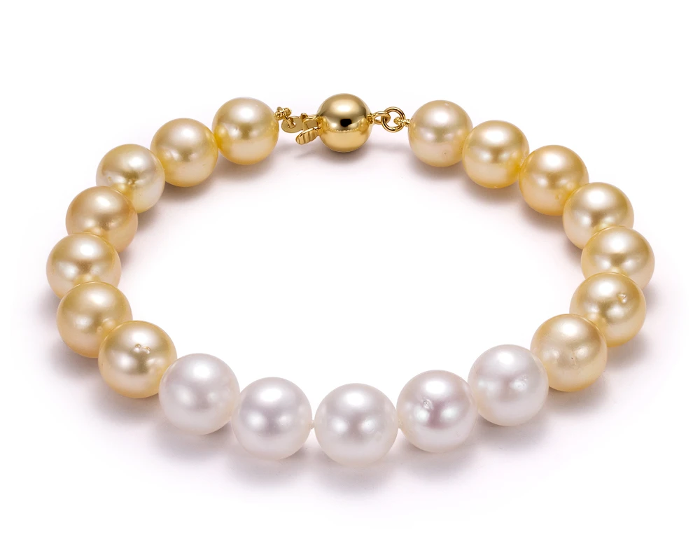 Классический браслет собран из идеально круглых жемчужин белого и золотистого цвета, рожденных в Австралии.