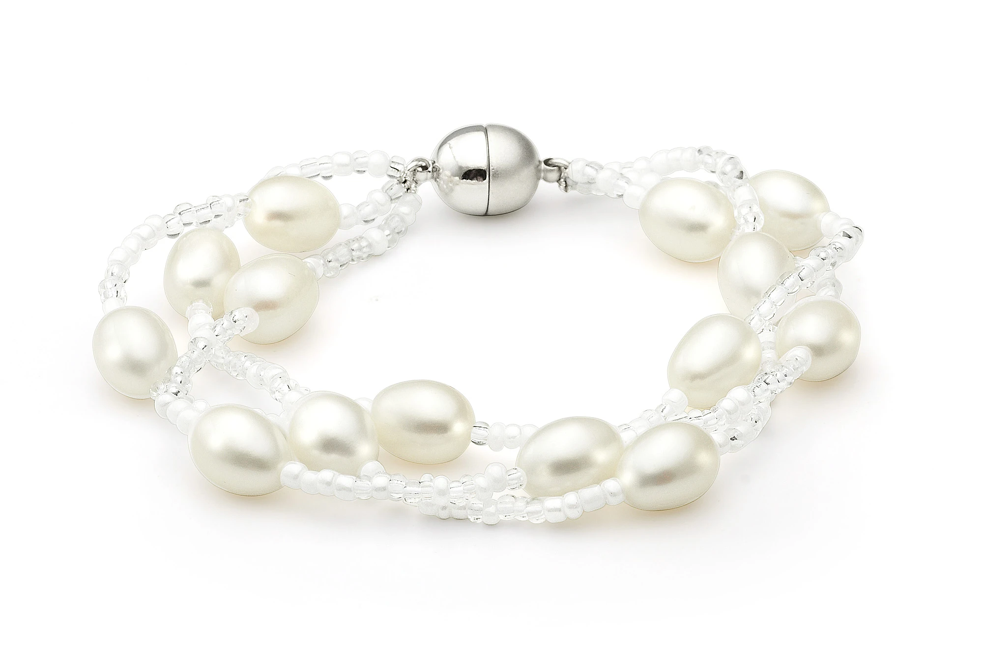 Браслет в 3 ряда из белого рисообразного речного жемчуга 7,5-8 мм с бисером, (2265(9900))