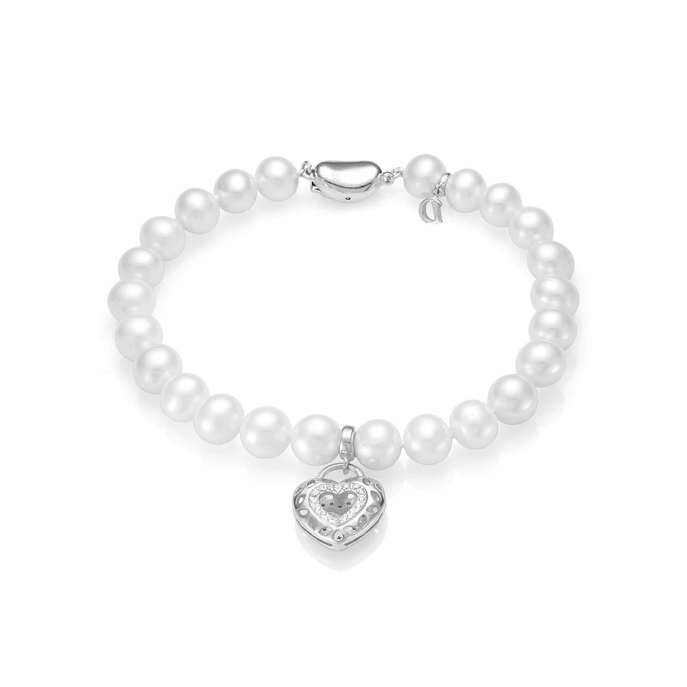 Браслет из белого речного круглого жемчуга 7,5-8 мм с подвеской из серебра , (4107)