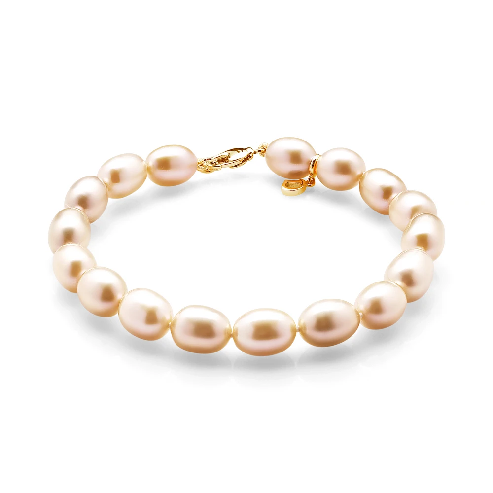 Браслет собран из рисообразных речных жемчужин персикового цвета.