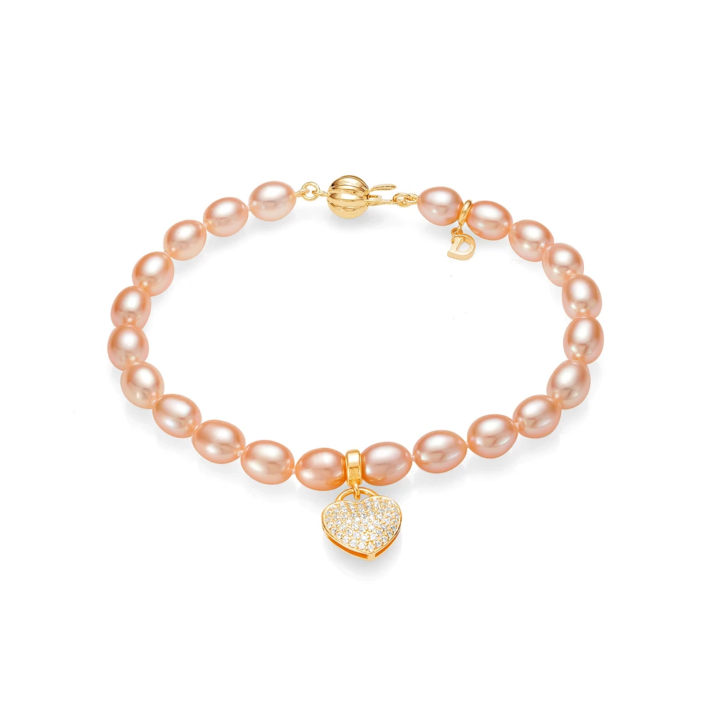 Браслет из розового речного жемчуга 6-6,5 мм с подвеской "Сердечко", (4105)