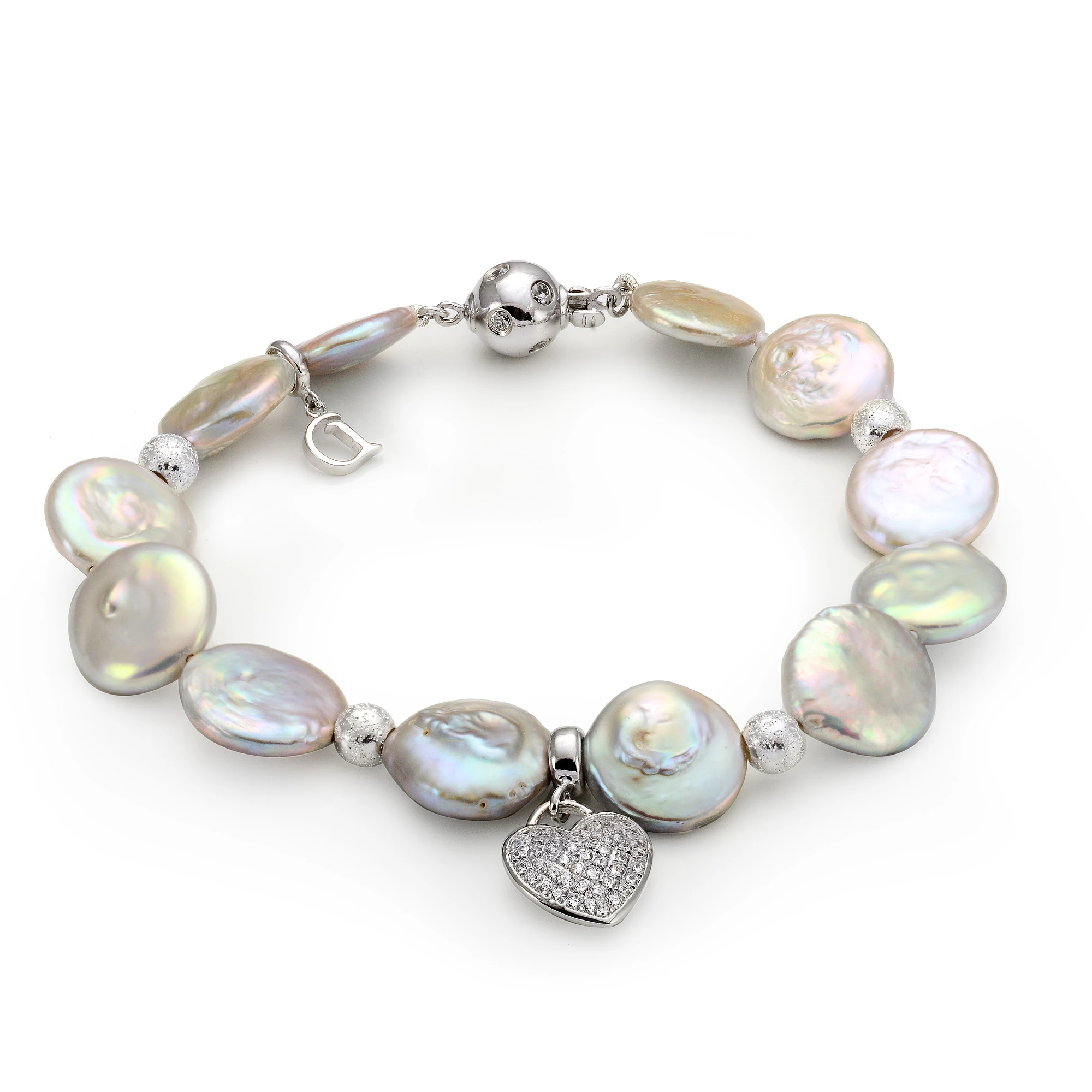 Классический браслет собран из жемчужин серебристого цвета, украшен вставками из серебра 925 пробы и подвеской «Сердце», украшенной фианитами.
