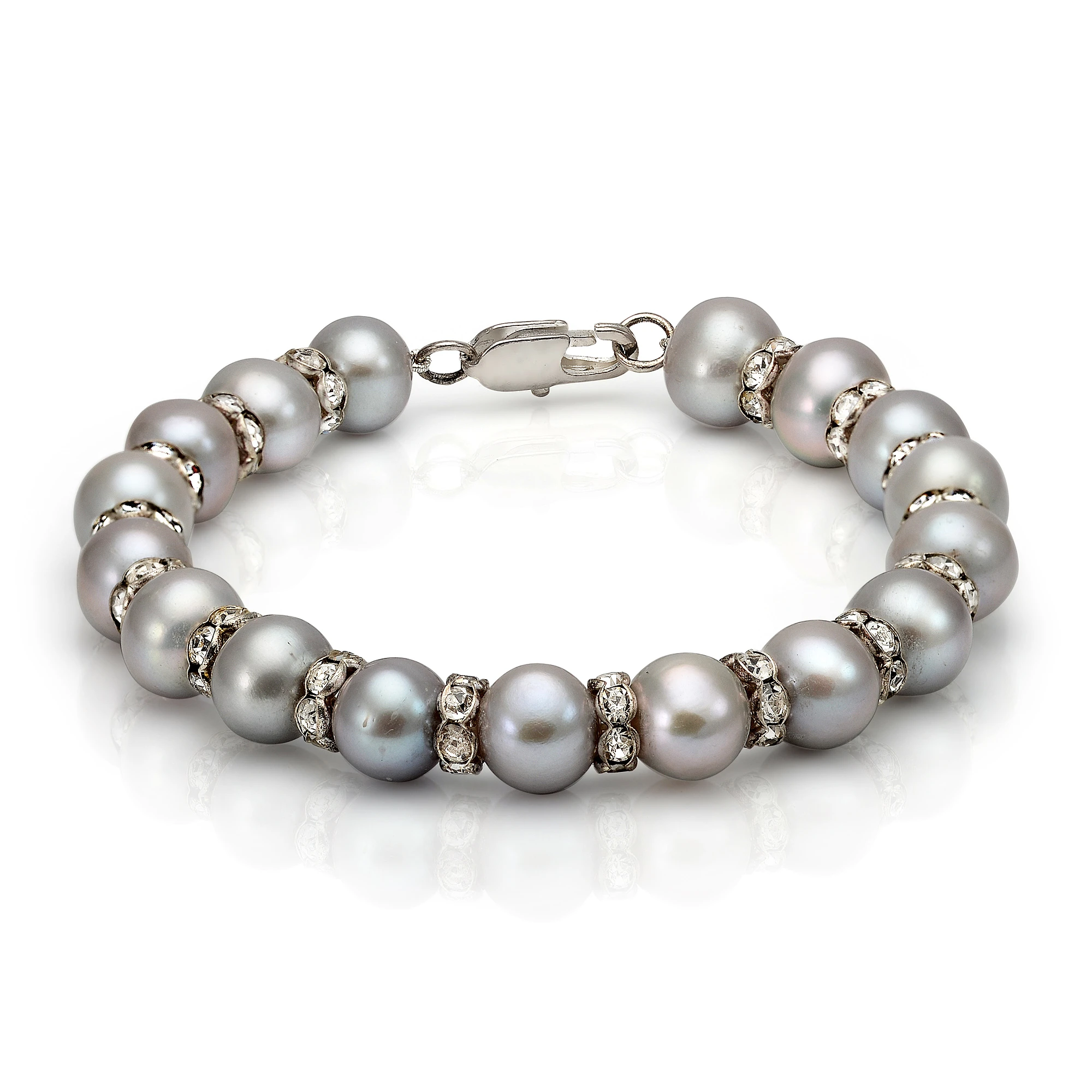 Классический браслет собран из идеально круглых жемчужин серебристого цвета и украшен стразами из ювелирного сплава с фианитами.