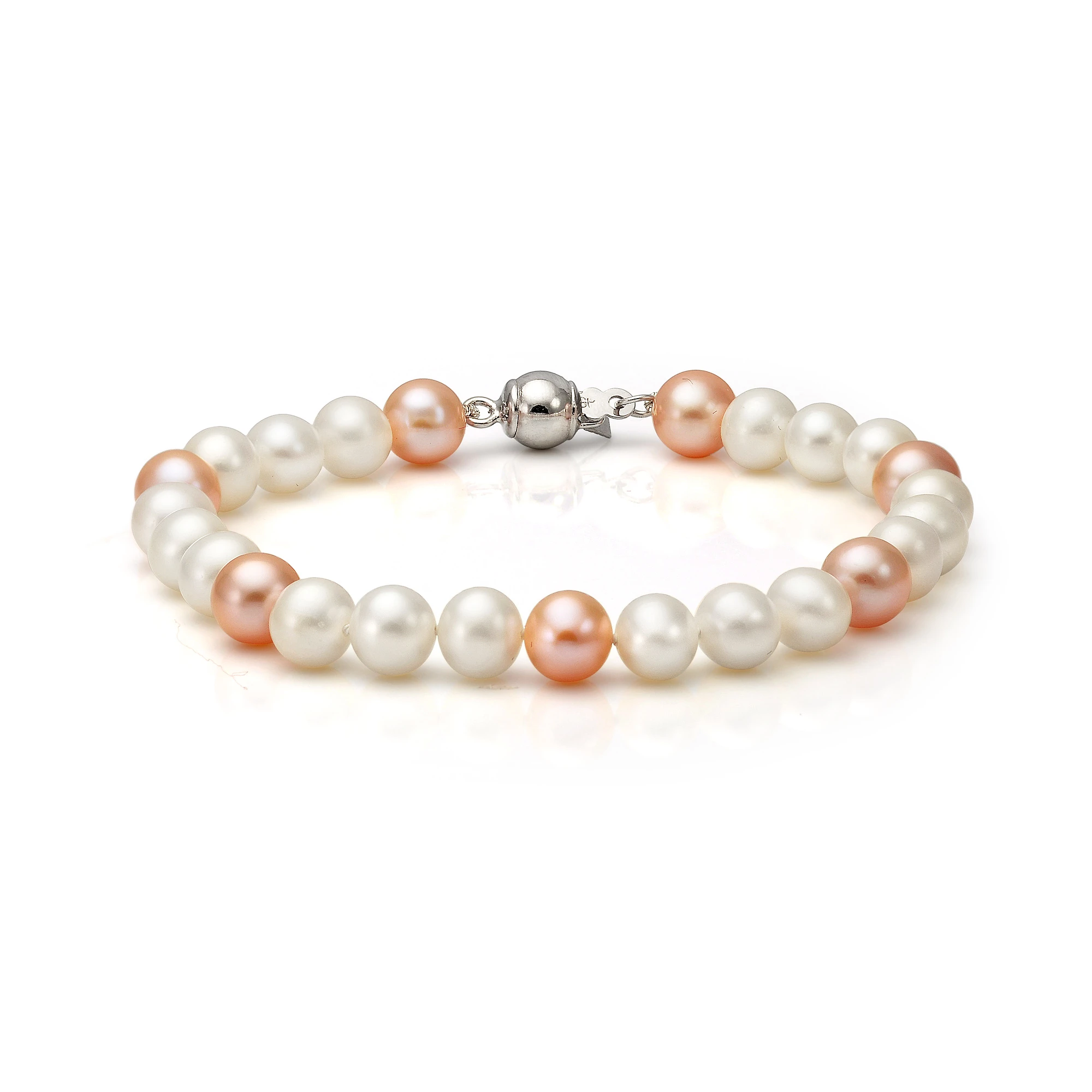 Классический браслет собран из идеально круглых жемчужин белого и розового цвета.