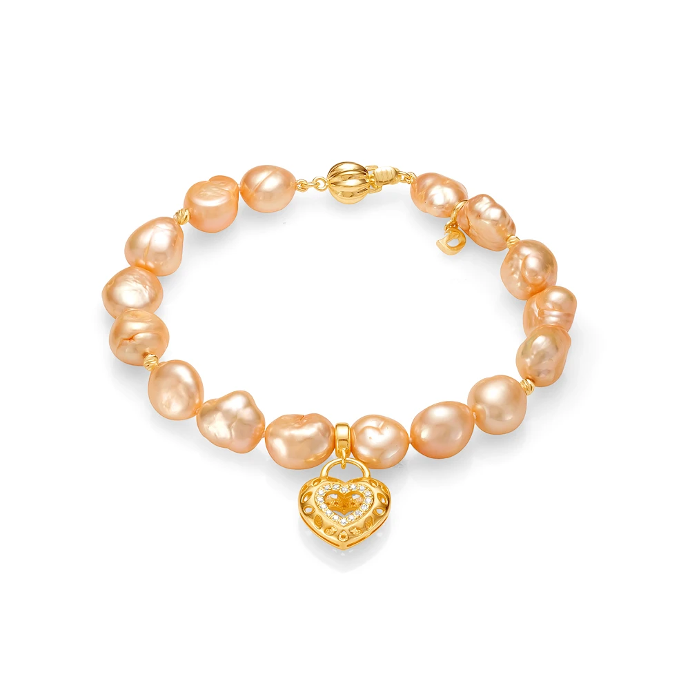 Браслет "Сердце" из золотистого барочного жемчуга 10-11 мм с подвеской из серебра, (4102(4500))