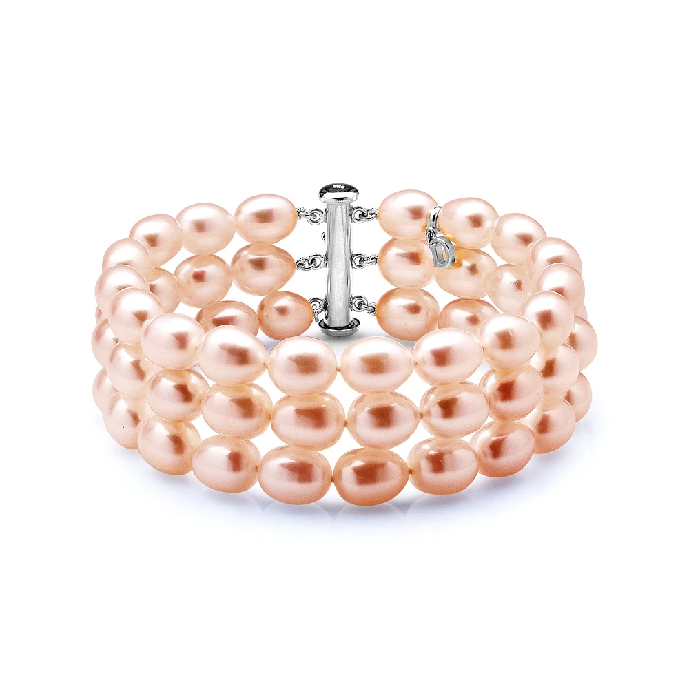 Браслет в 3 ряда из розового рисообразного речного жемчуга. Жемчужины 7,5-8 мм, (3213(15000))