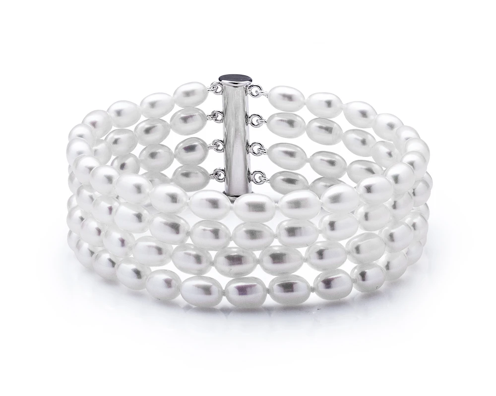 Браслет в 4 ряда из белого рисообразного речного жемчуга. Жемчужины 4-4,5 мм, (3210(7700))