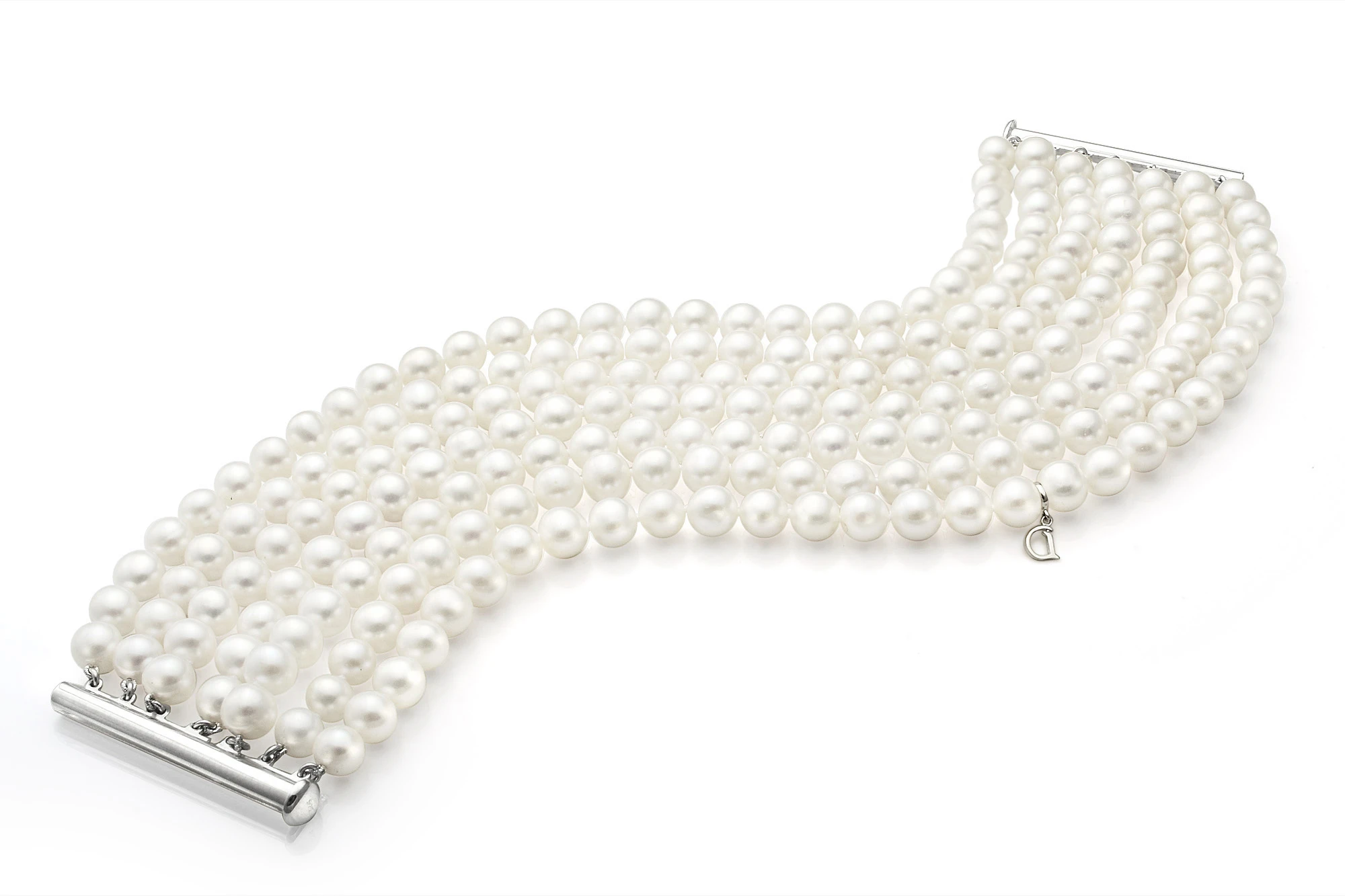 Браслет собран в семь рядов из круглых речных жемчужин белого цвета.