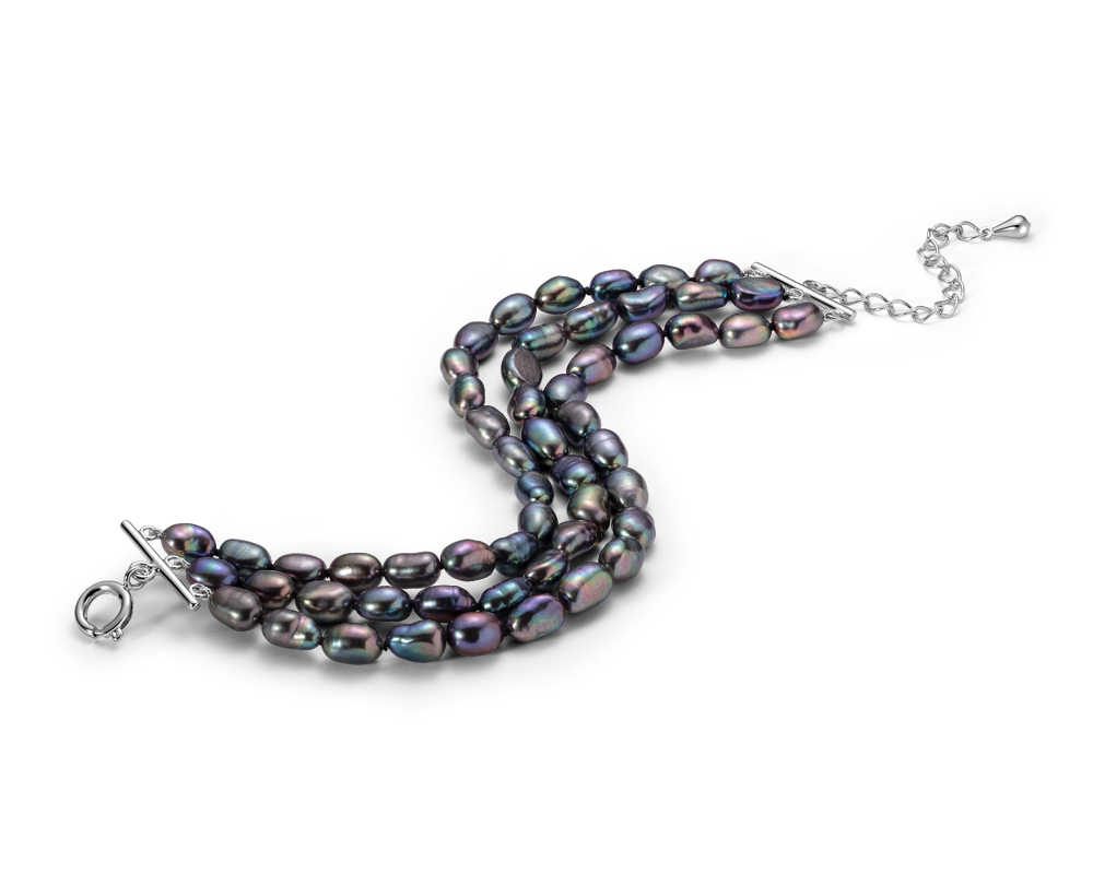 Браслет собран в три ряда из барочных речных жемчужин черного цвета.